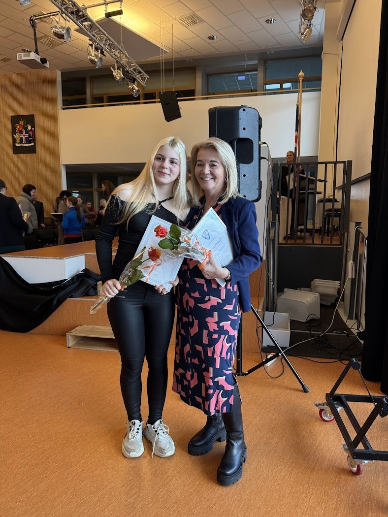 Frá okkur í Síðuskóla hlutu þær Ólöf Inga skólastjóri og Victoria Irkha nemandi í 9. bekk viðurkenningu. Meðal þess sem nefnt var um Ólöfu er að gott sé að leita til hennar, hún hafi skapað notalegt umhverfi fyrir nemendur og starfsfólk og byggt upp á faglegan og metnaðarfullan hátt sérdeild skólans með sínu starfsfólki. Í umsögn Victoriu sem kom í skólann frá Úkraínu haustið 2023 kom fram að hún sé dugleg, sýni mikinn metnað í námi, sá ávallt jákvæð og hafi lagt sig fram og sýnt mikinn áhuga á íslenskunámi og hafi á stuttum tíma náð afar góðum tökum á íslensku.